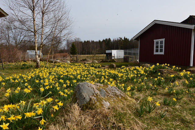 I Trädgården blommar det med tusentals påskliljor.